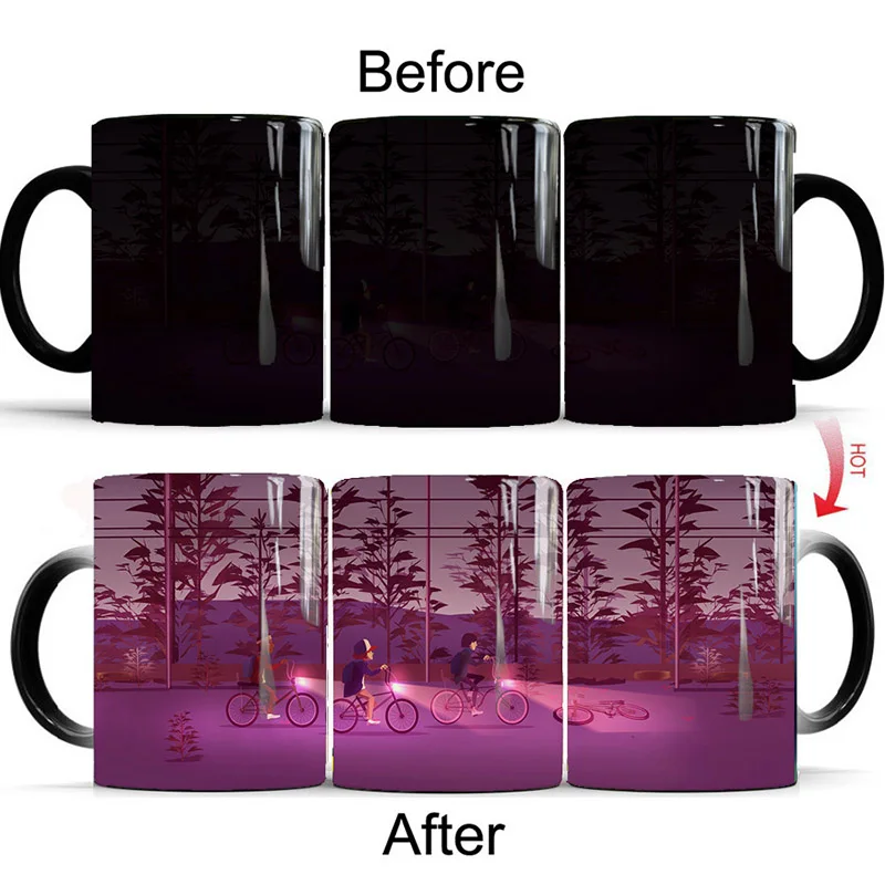 Heat sensitive material on the mug surface turns color when hot liquid is poured in