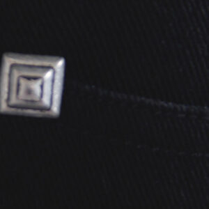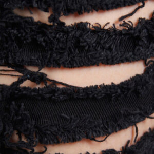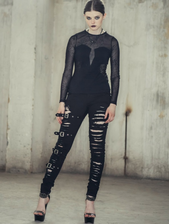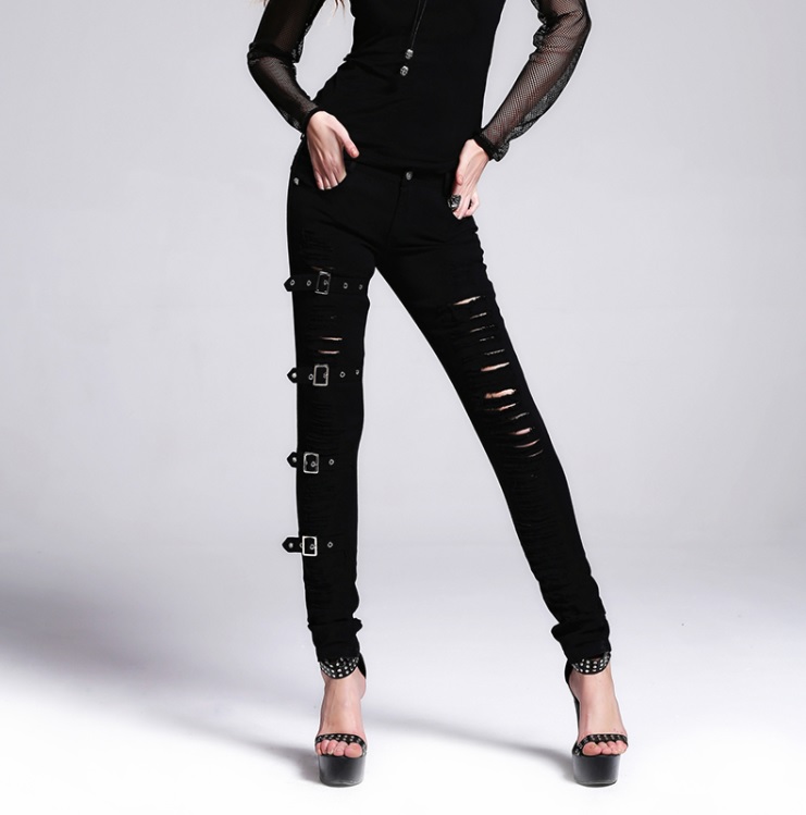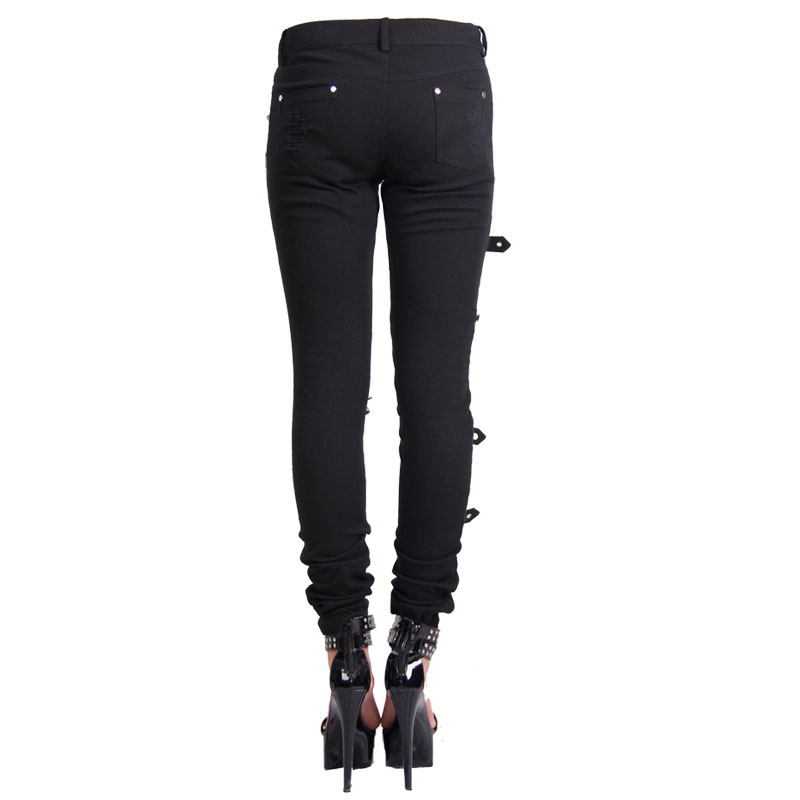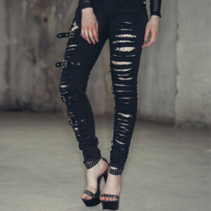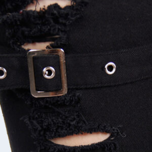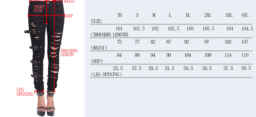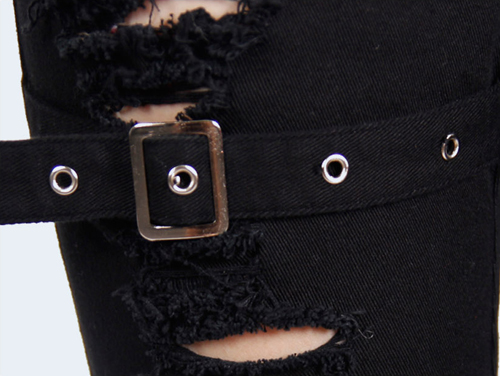Black denim fabric Anti-tear shredded openings Elastic twill fabric Pocket with pyramid rivets Right leg has four adjustable belts with vintage buckle Measurement chart attached