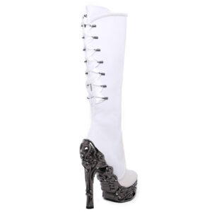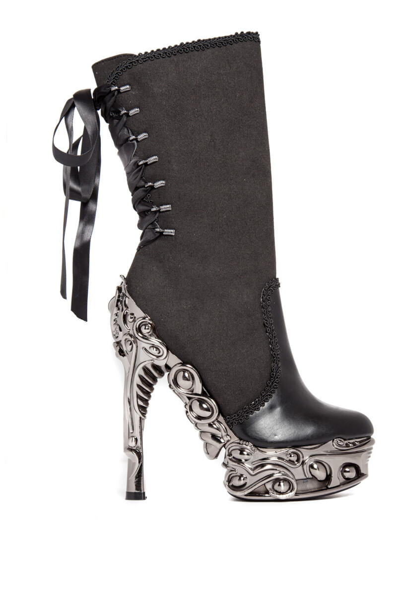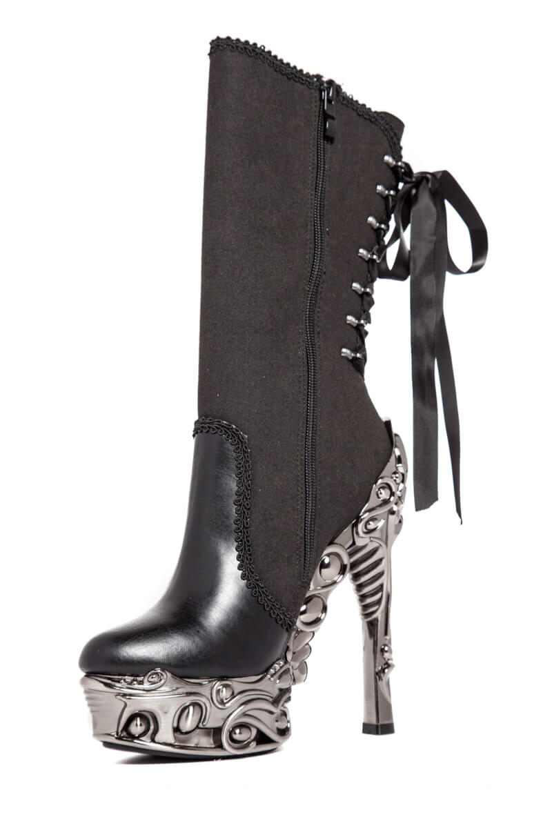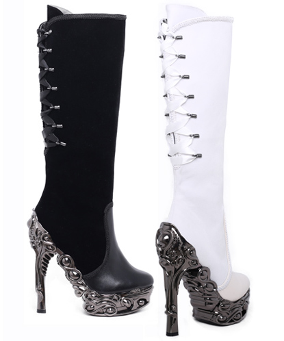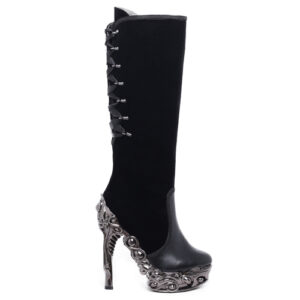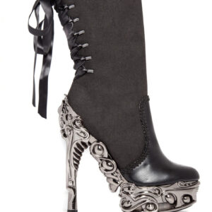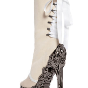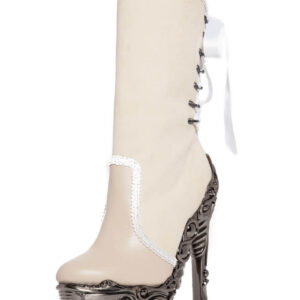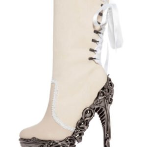 Micro-suede boots with adjustable satin laces. Hand embroidered Victorian design on front and top. Part of our exclusive Proteus designer collection. 5 inch custom molded heel, 1.5 inch platform. Available in black and white. Goes great with wedding outfits!