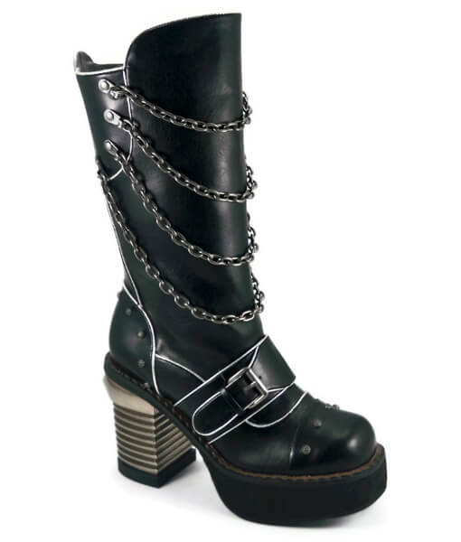 The long awaited chucky heel, under the knee boot has arrived! The heel is 4 inches with a 1.5 inch platform in the front. Adored with metal chains and screw topped rivets. A unique designed metallic styled heel. Buckle strap across the front. Easy access inside zipper. This boot is quite versatile and compliments many an outfit