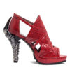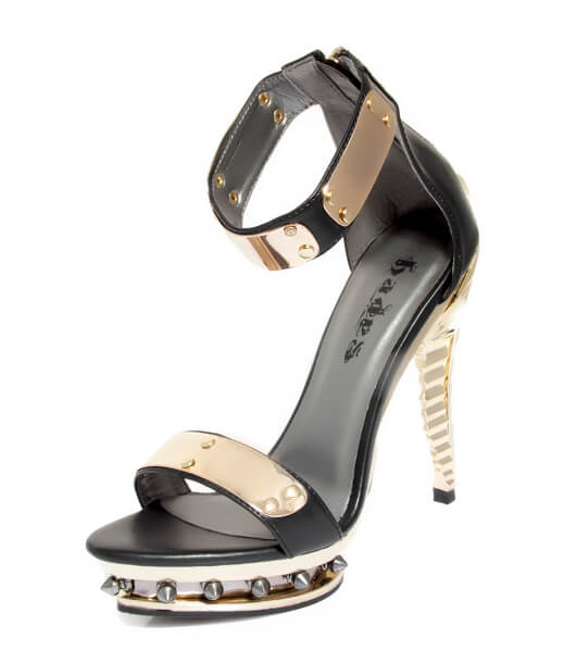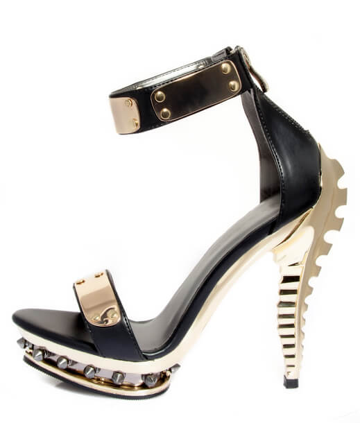 Black and gold open toed pump with small spiked platform. Plated front and ankle straps with zipper back skeleton heel.