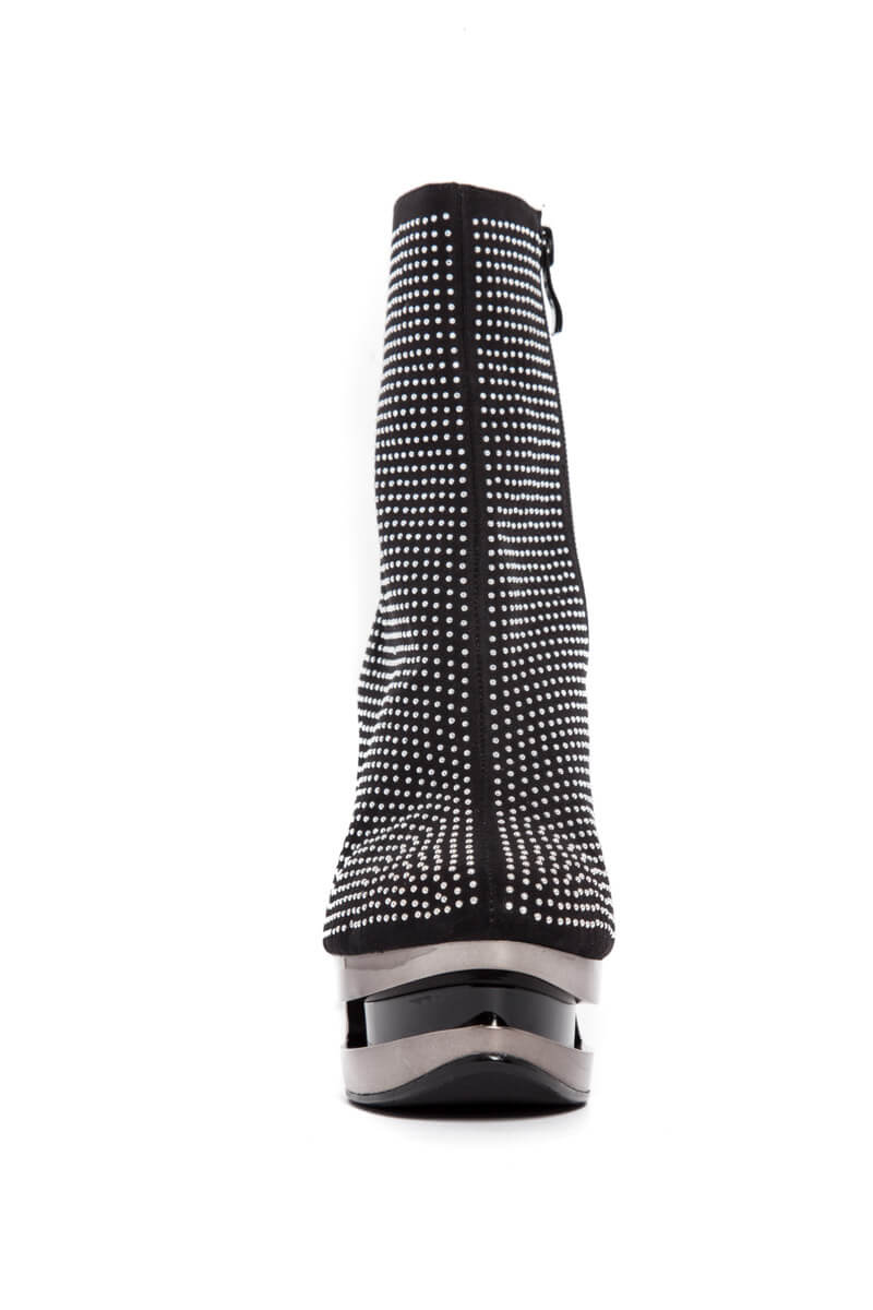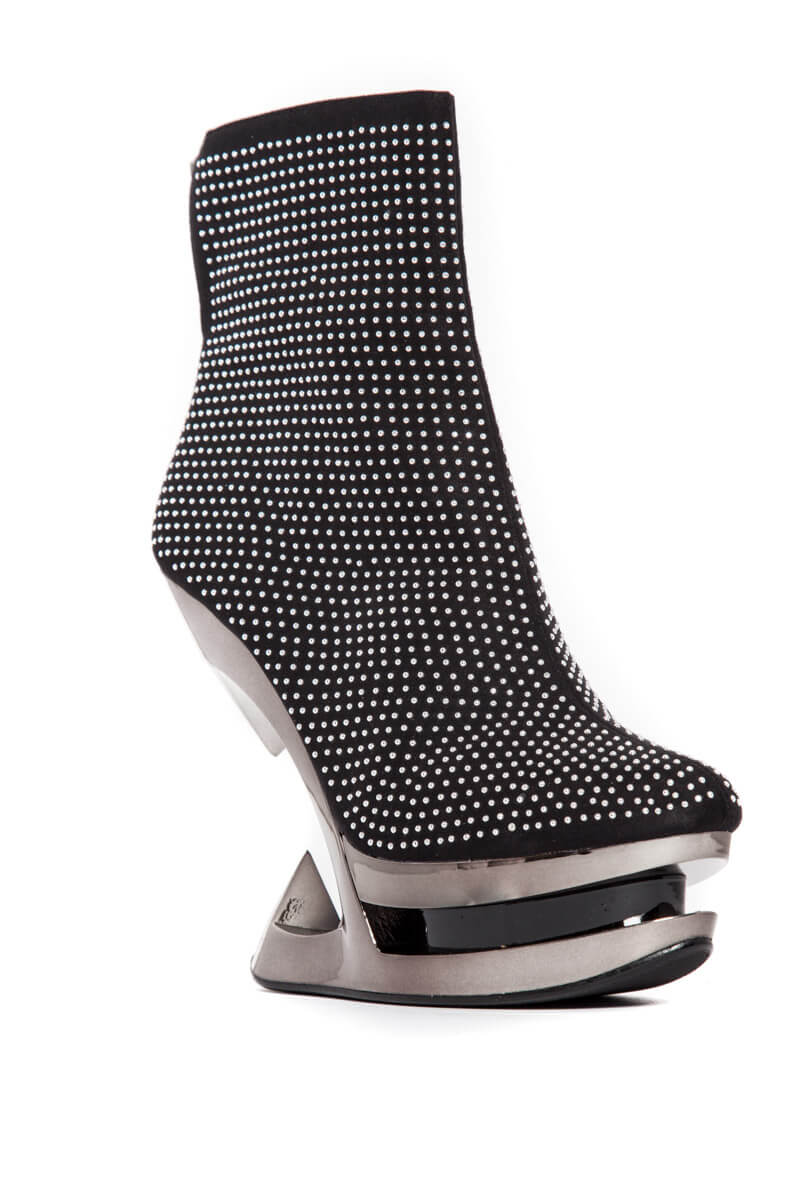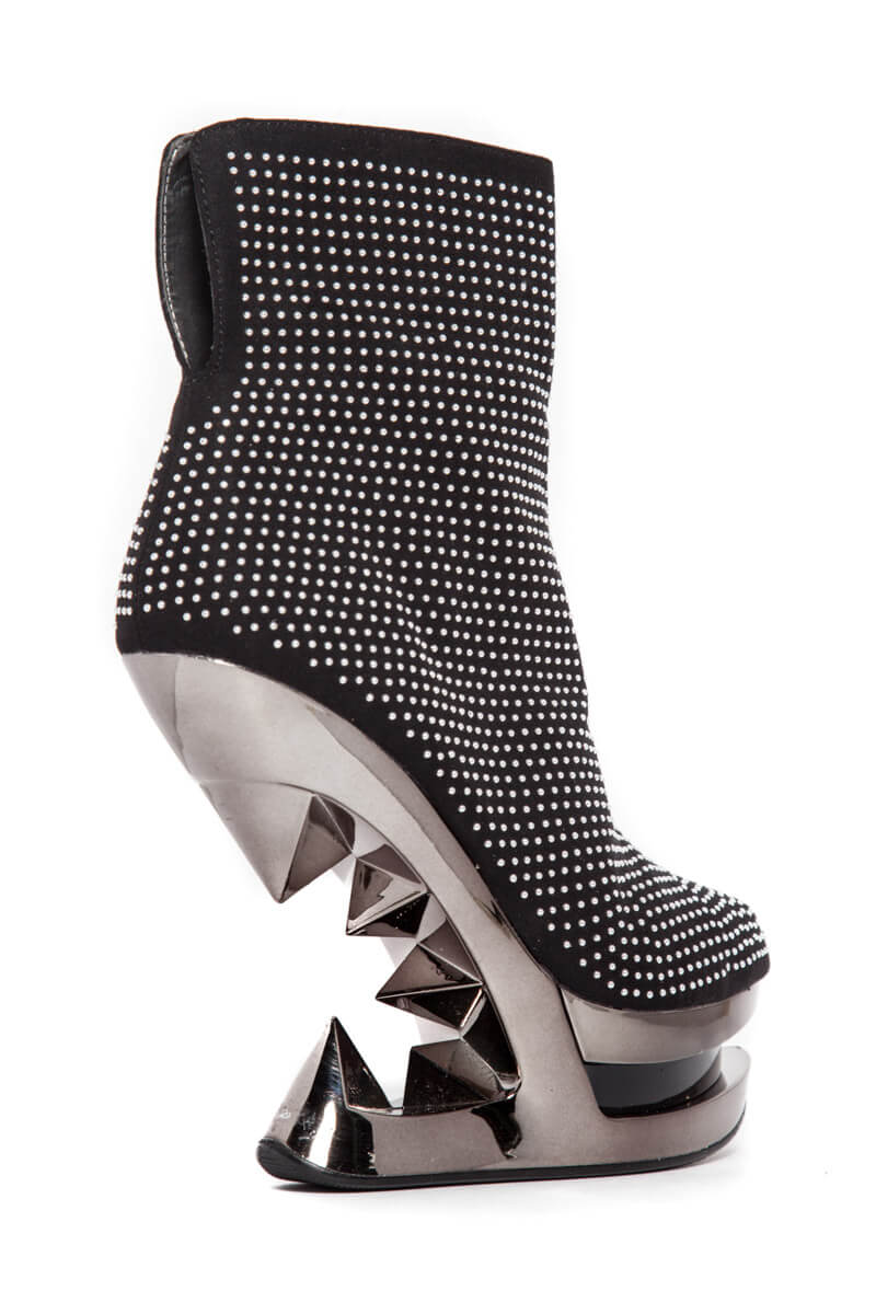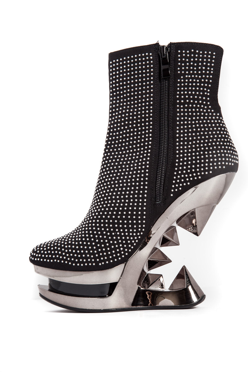 Elegantly studded iceberg wedge heels. 5″ heel height. Inner zipper.