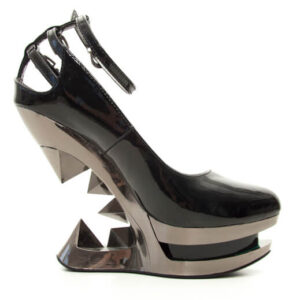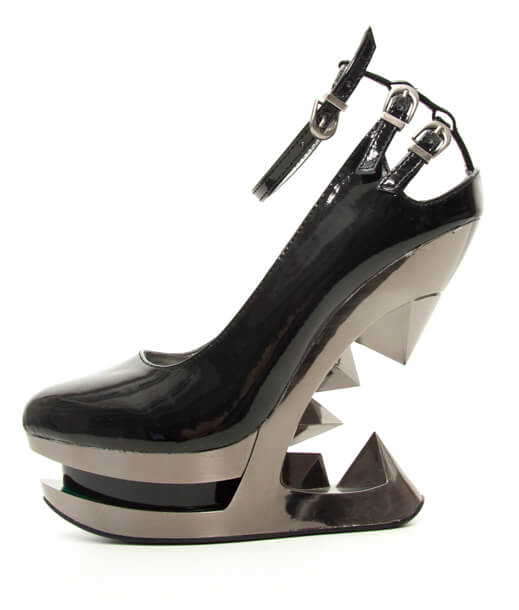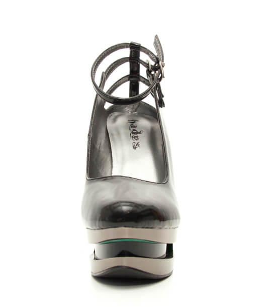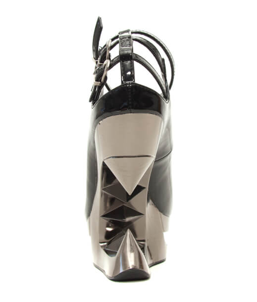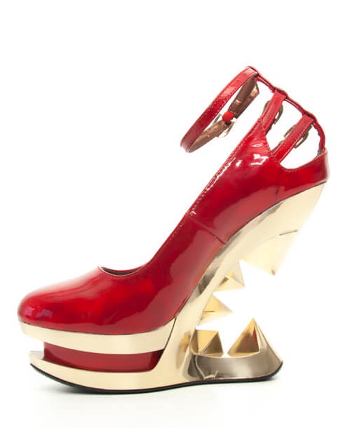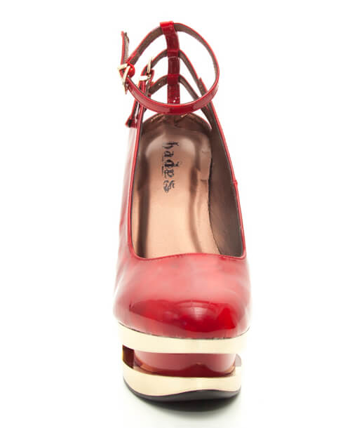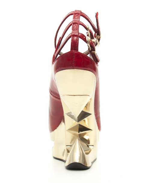 Patent leather iceberg wedge pump in black/metal or red/gold colorways. Three cut out ankle straps with buckles.