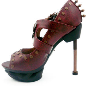 Steampunk style peep toe pumps w/ thundra PU material. Adorned w/ machinery rivets, spikes and metal butterfly on adjustable straps. Stretchable elastic for comfortable fit.
