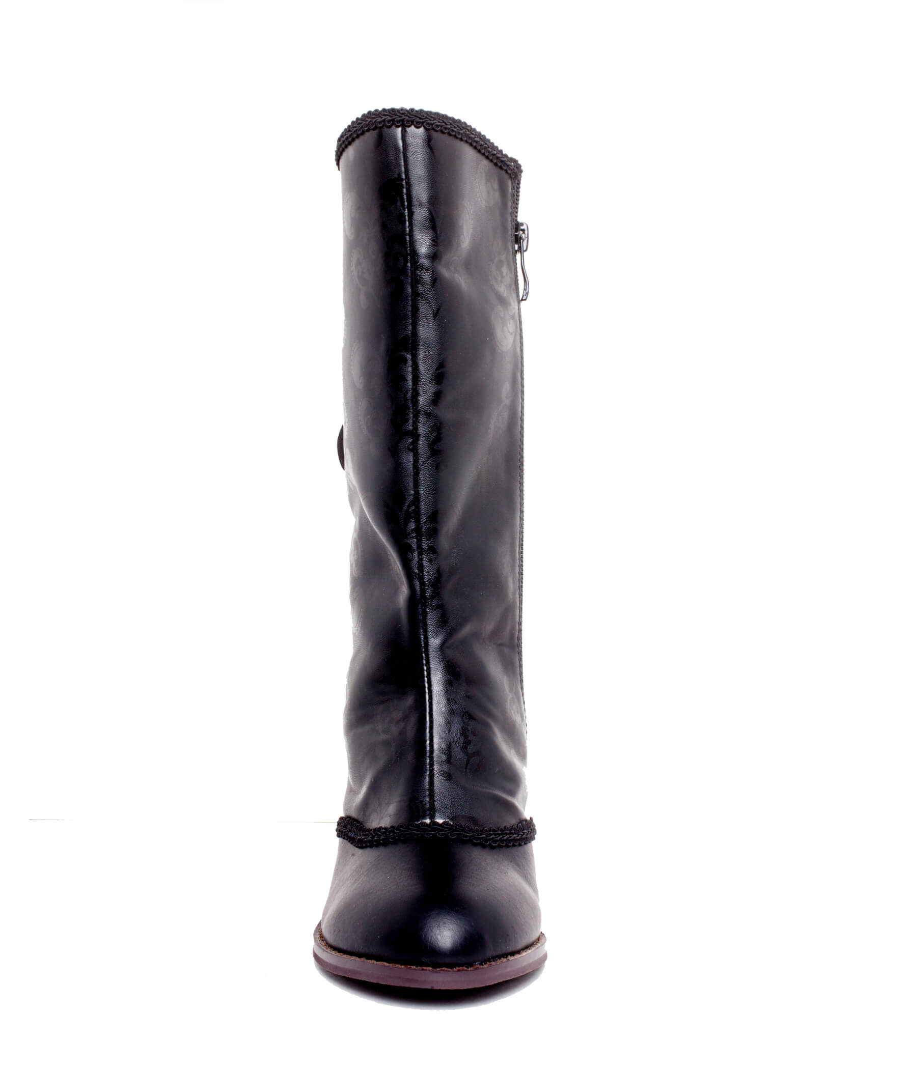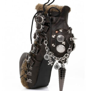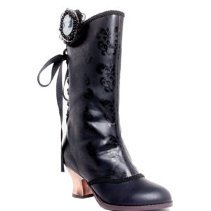 Steampunk Victorian ankle boots w/ 2.5″ bronze vintage heel, renaissance decoration print embedded into animal friendly black PU material, adjustable back laces & inner zipper, detachable pin included.