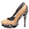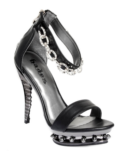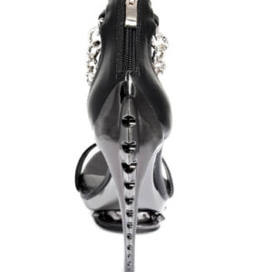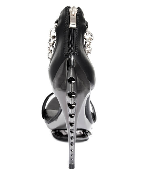 Black open toe strapped pump with small spiked platform. Ankle strap accented with silver chain and skeleton heel.