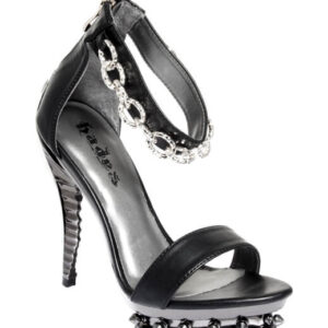 This a elegant Victorian influenced closed toe high heel with a slash of sparkle and dazzle. The heel is 4 inches with a 1.5 inch platform in the front. The heel is adorned with metal lace and a sparkly rhinestones. Made of mirco-suede